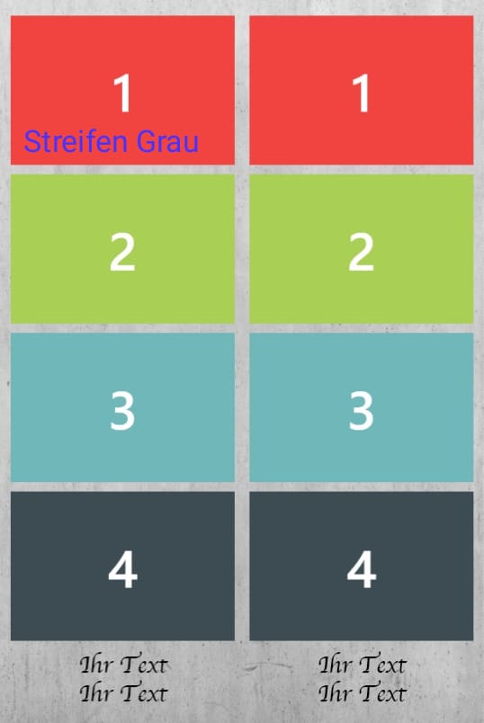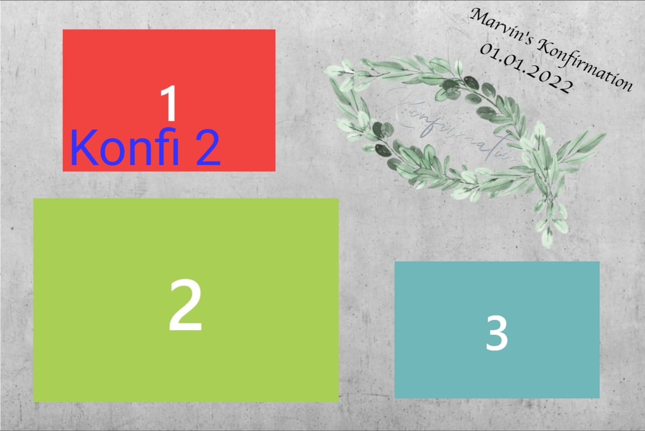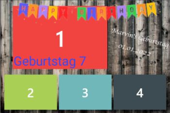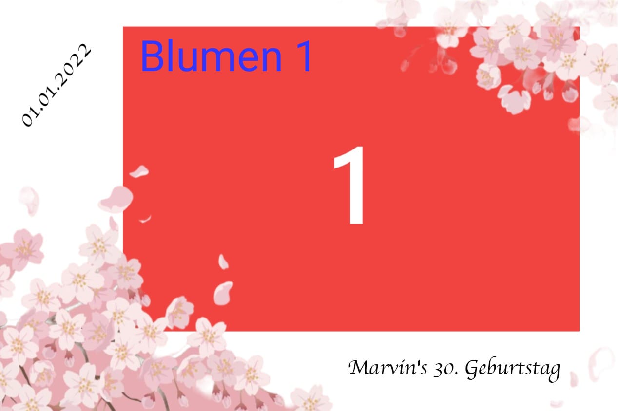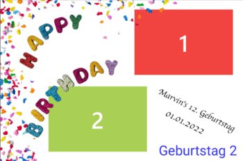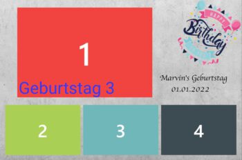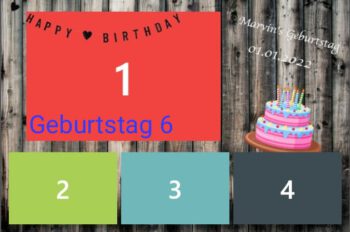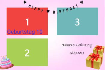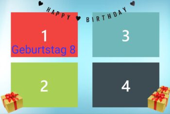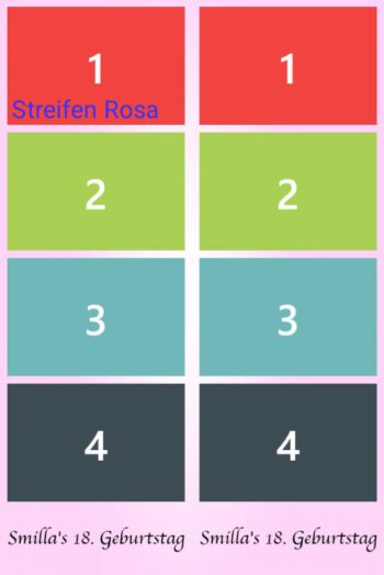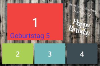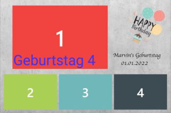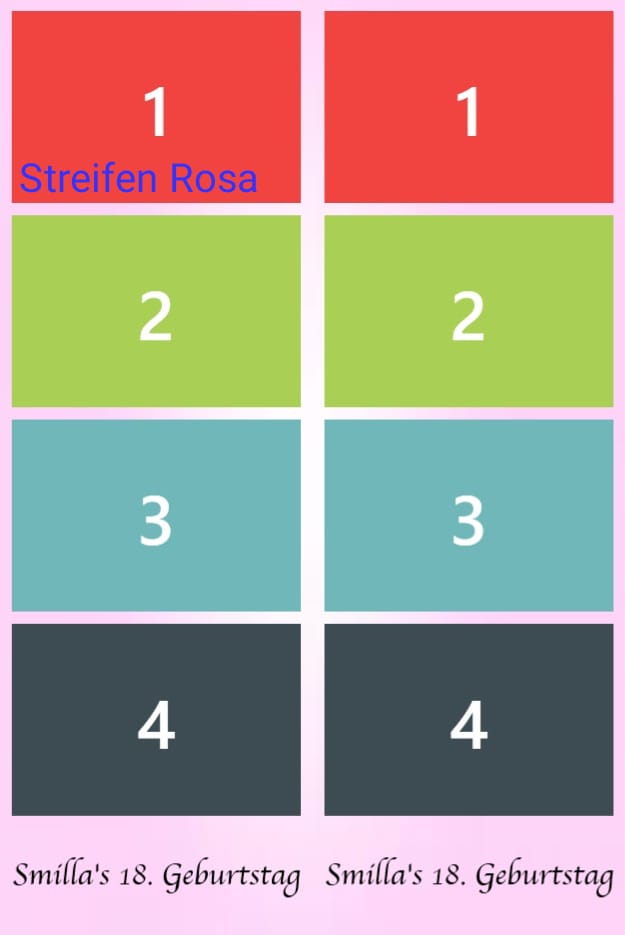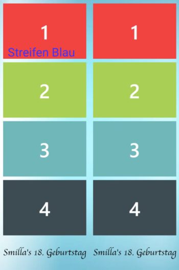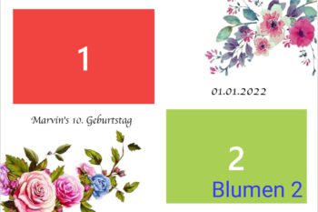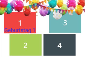 Geburtstag | Geburtstag 1, Geburtstag 2, Geburtstag 3, Geburtstag 4, Geburtstag 5, Geburtstag 6, Geburtstag 7, Geburtstag 8, Geburtstag 9, Geburtstag 10, Blumen 1, Blumen 2, Blumen 3, 3 Bilder Grau, Ein Bild, Konfi 1, Konfi 2, Konfi 3, Streifen Grau, Streifen Blau, Streifen Rosa |